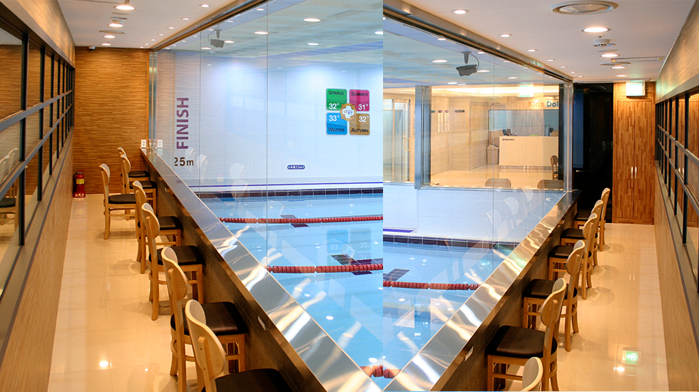 25m 정규레인 4개, 수심 0.8~1.1m, 사계절 31~33도 따뜻한 수온, 친환경 해수풀, 실시간 수업생중계