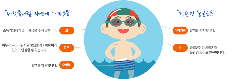 수영장물에 인체의 체액염분농도와 유사한 염분농도(0.6%)를 인공적으로 조성한 후 전기분해를 통해 복합 살균 물질을 발생시켜 수영장을 맑고 보석처럼 빛나는 상태로 유지시켜주는 친환경 시스템입니다.