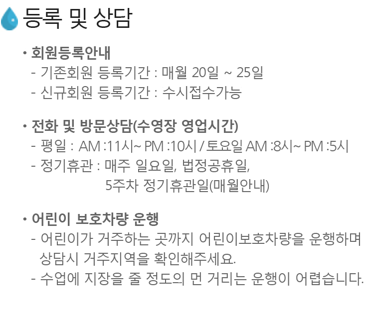 수영 영법위주의 수업진행으로 균형있는 신체발달, 심폐지구력, 체력이 필요한 어린이들에게 적합 |