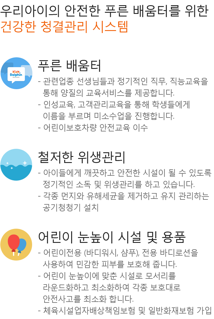 | 공휴일/일요일 | 휴강 | 자유수영 | 일반 수영장은 일요일/공휴일에는 자유수영 및 일부 강습을 실시하여 수질 관리에 소홀할 수 있으며, 검증되지 않은 비회원들의 출입으로 수질관리에 차질을 빚을 수 있습니다.키즈돌핀은 주 1회 휴강과 월1회 정기 관리를 통하여 수질 및 위생관리를 합니다. |